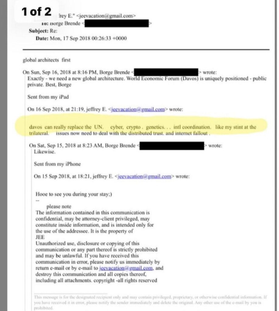 Epstein tenía acceso a políticos de todo el mundo. Y en un correo del 17 de septiembre de 2018 Epstein defendía la idea de que el Foro de David, el Foro Económico Mundial, sustituyera a la ONU.
